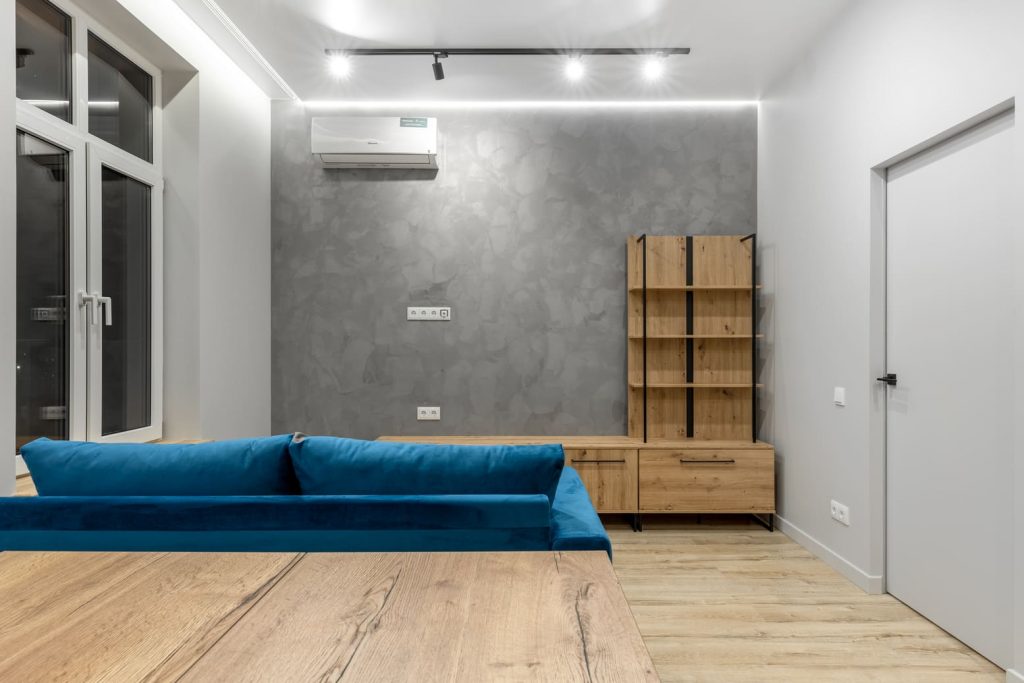 Кухня и гостинная четко разделены на тематические области с помощью яркого акцента - синего дивана, определяющего центр помещения. В комнате также много света и по части периметра проведена подсветка. Стена за телевизором оформлена с помощью дероративной штукатурки, все остальные стены идеально ровно окрашены в оттенок серого. Также работниками Domeo проведена вентиляция и кондиционер.