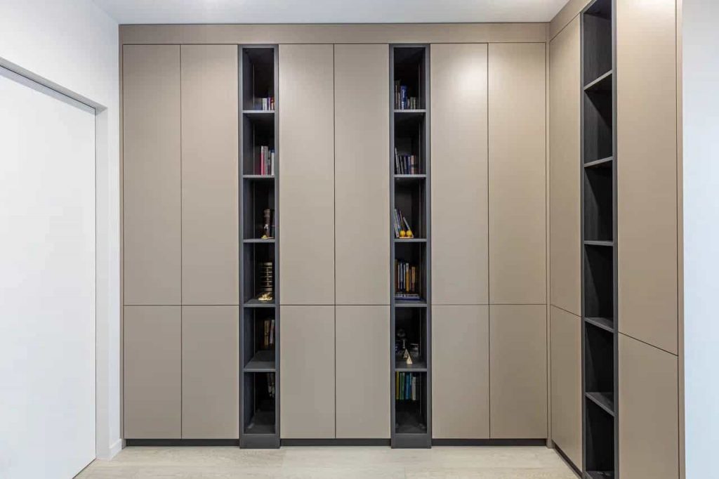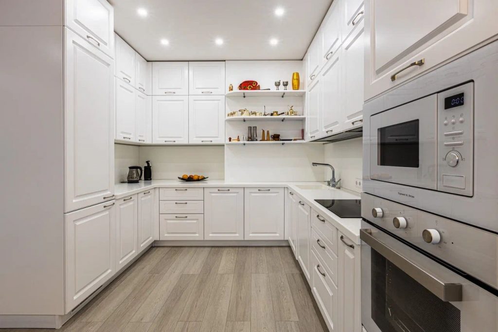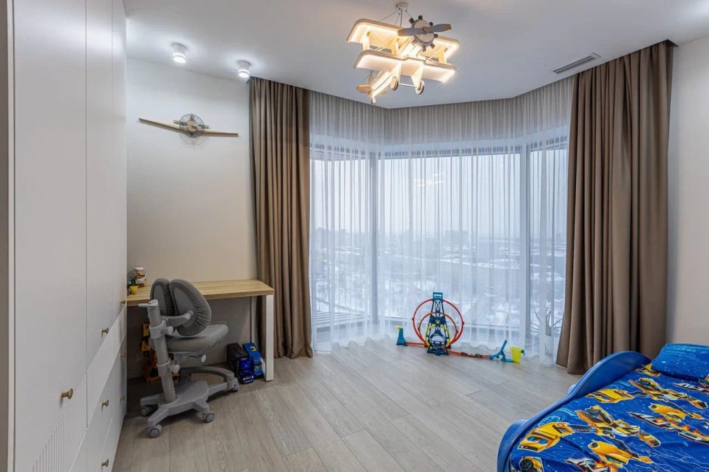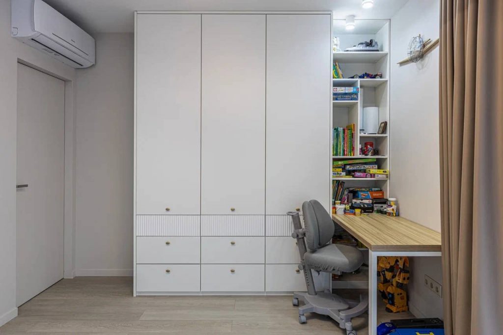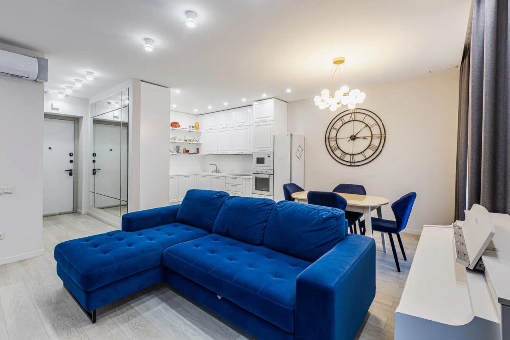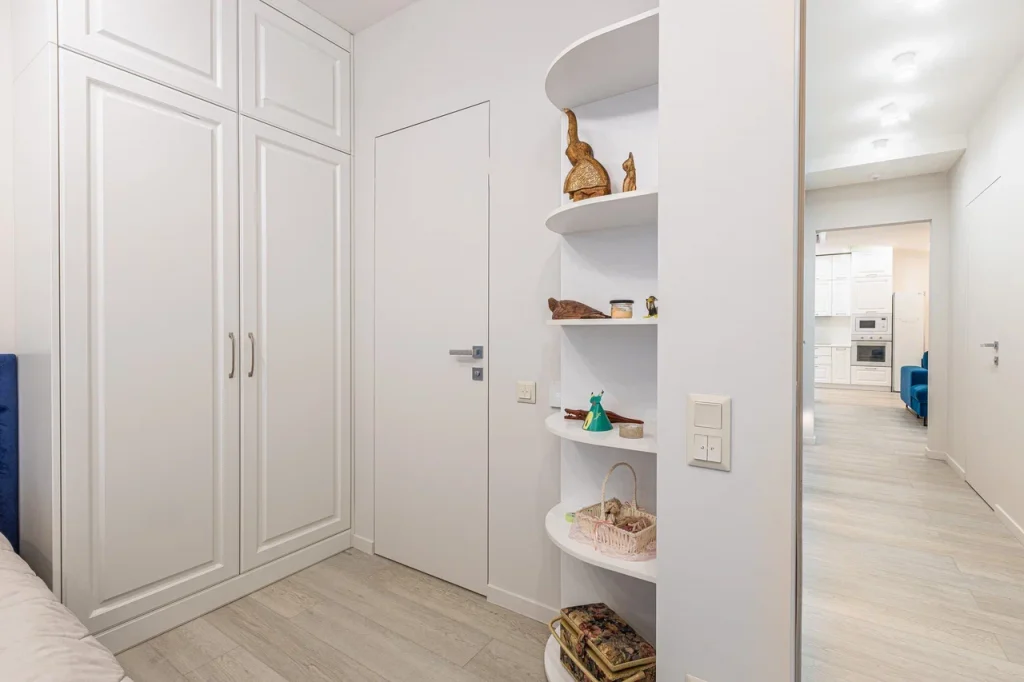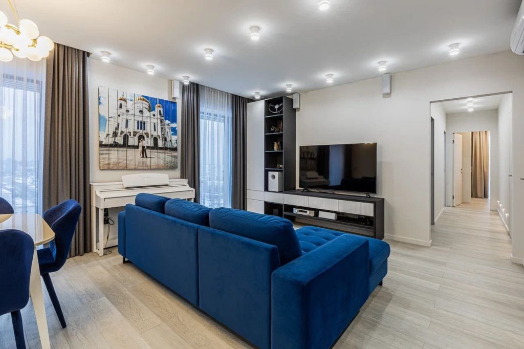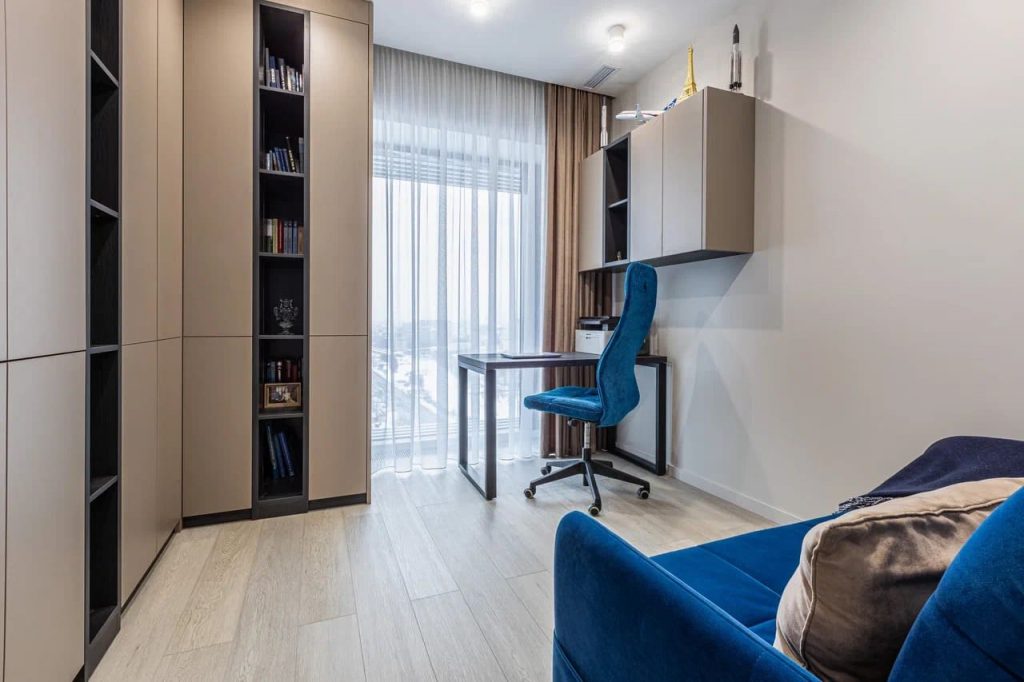 Ремонт четырехкомнатной квартиры с меблировкой и изготовлением мебели от Domeo, для большой семьи, с интерьером в светлых тонах и акцентом на синий цвет, с прихожей, кухней, гостиной, мастер-спальней, детской комнатой, кабинетом, постирочной и двумя санузлами