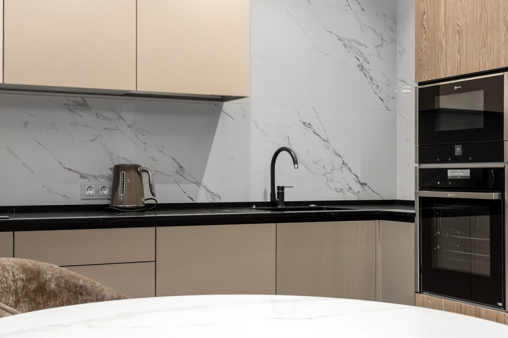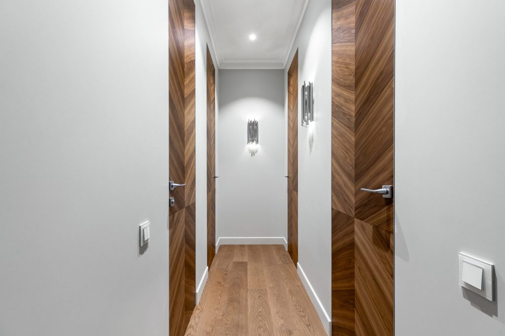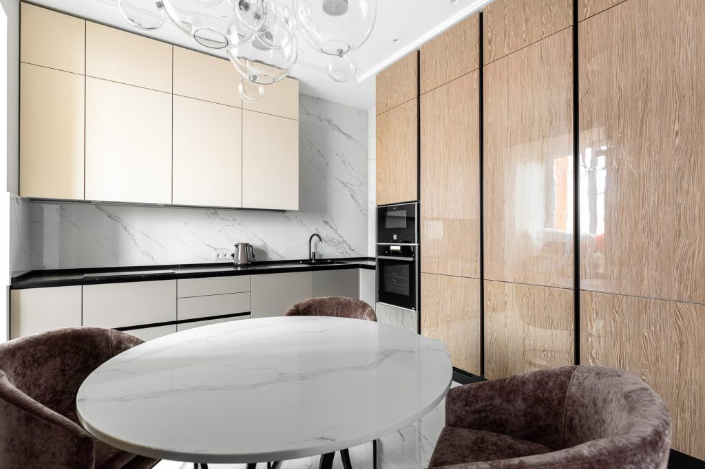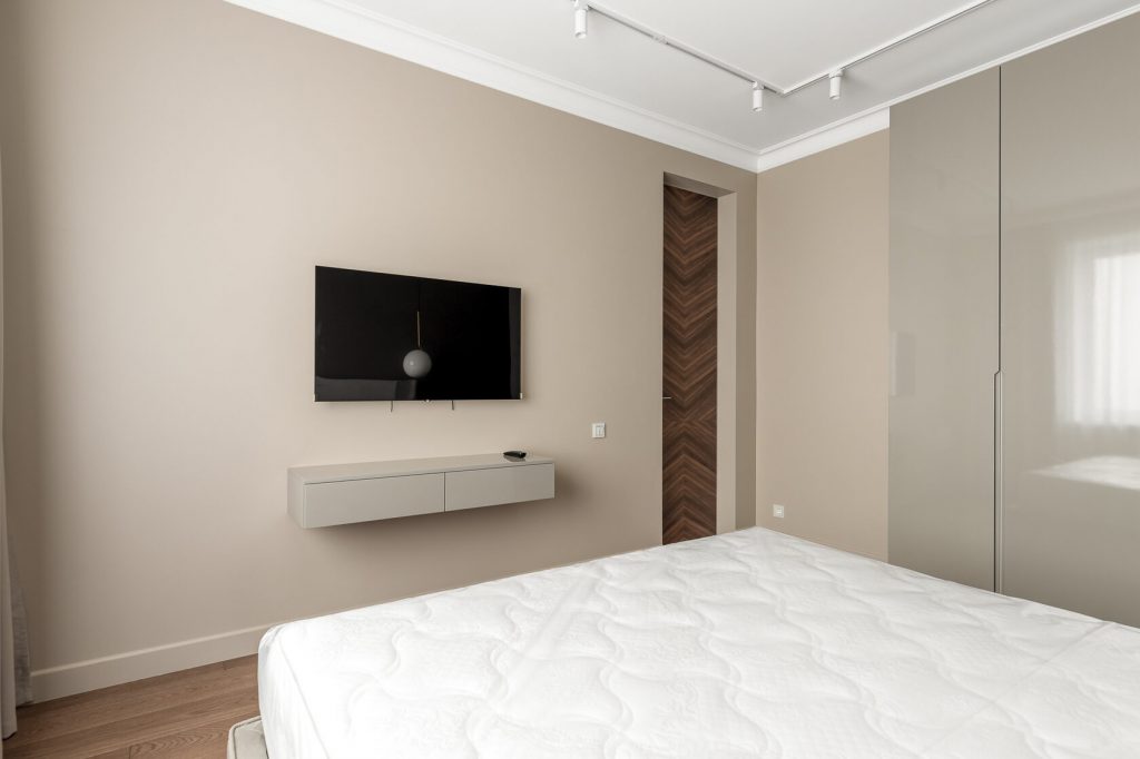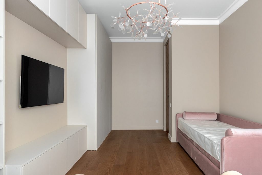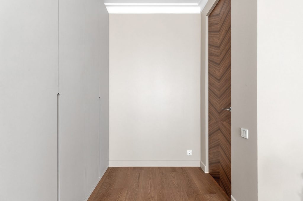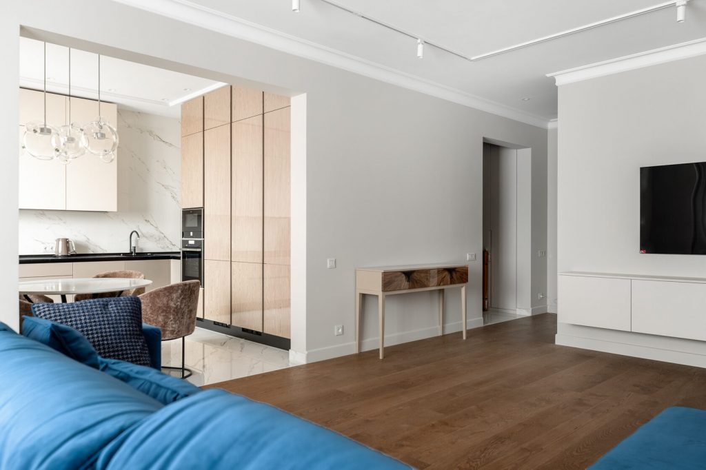 Заказчики данного проекта – молодая супружеская пара с маленьким ребёнком. Задача была создать стильный современный интерьер. При разработке дизайн-проекта были учтены все пожелания заказчика. Особое внимание к деталям – двери в шпоне ореха увеличенной высоты, отделочные материалы самого высокого качества, а также уникальная мебель, изготовленная по индивидуальным параметрам.