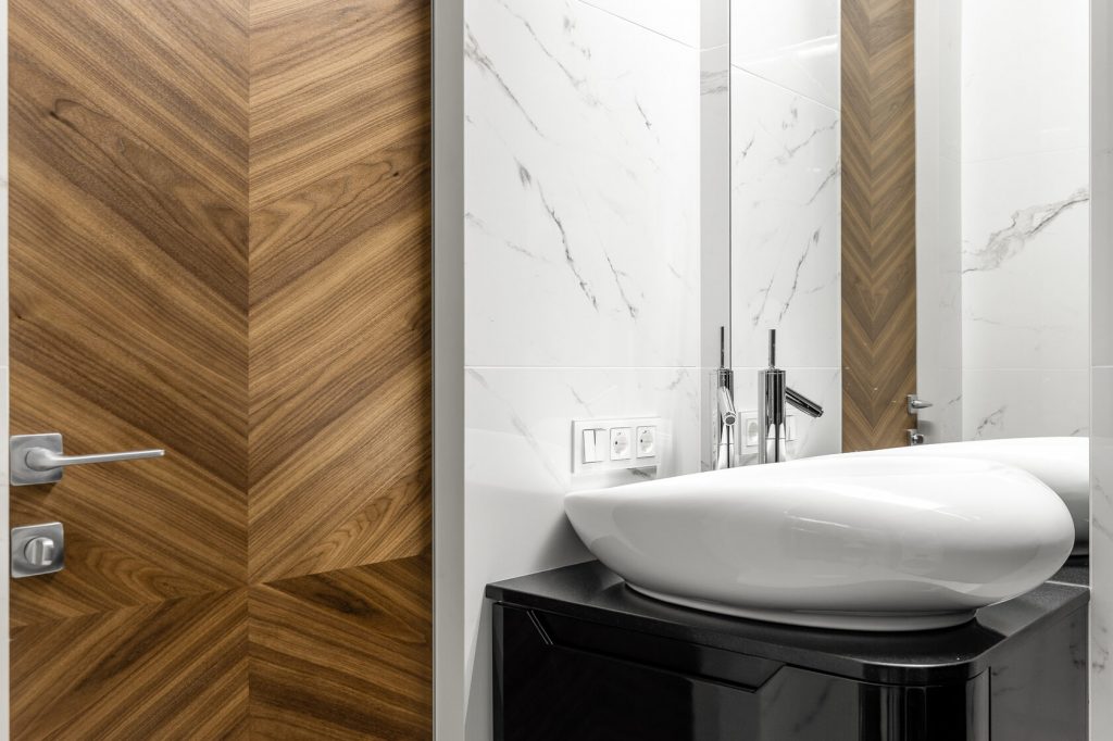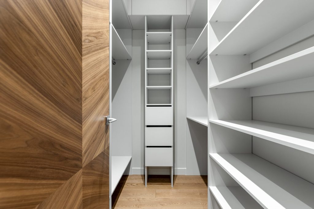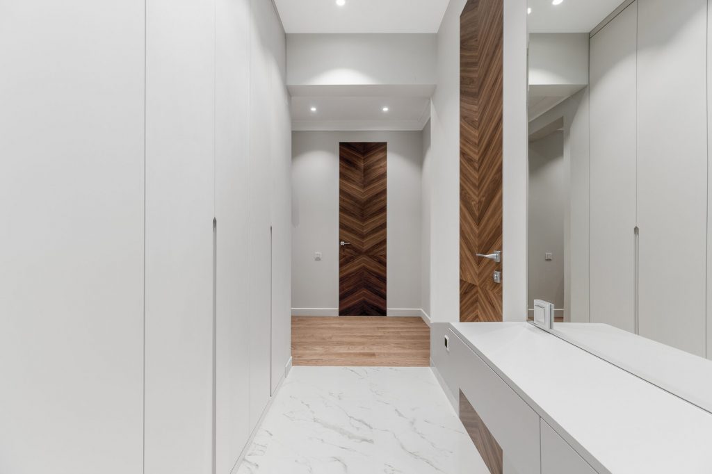 Ремонт трёхкомнатной квартиры с меблировкой и изготовлением мебели от Domeo, для молодой супружеской пары с маленьким ребенком, с акцентом на двери в шпоне ореха увеличенной высоты и с уникальной мебелью, с прихожей, кухней, гостиной, спальней, детской комнатой, гардеробной и двумя санузлами