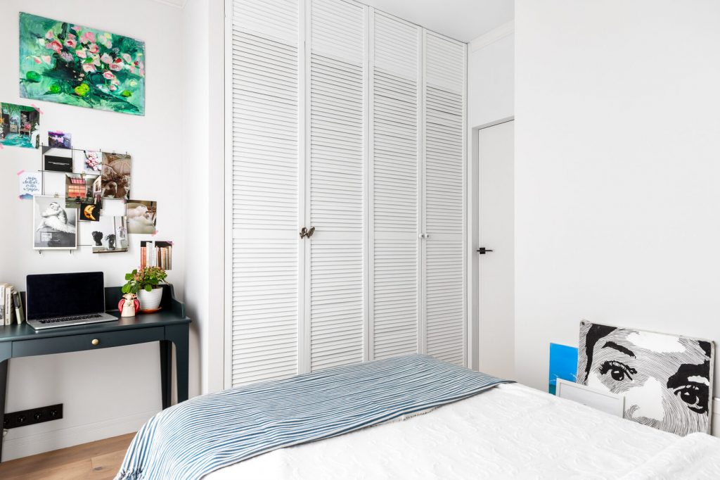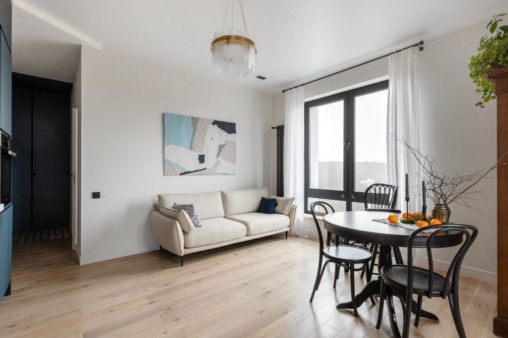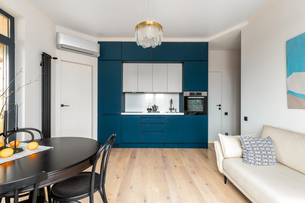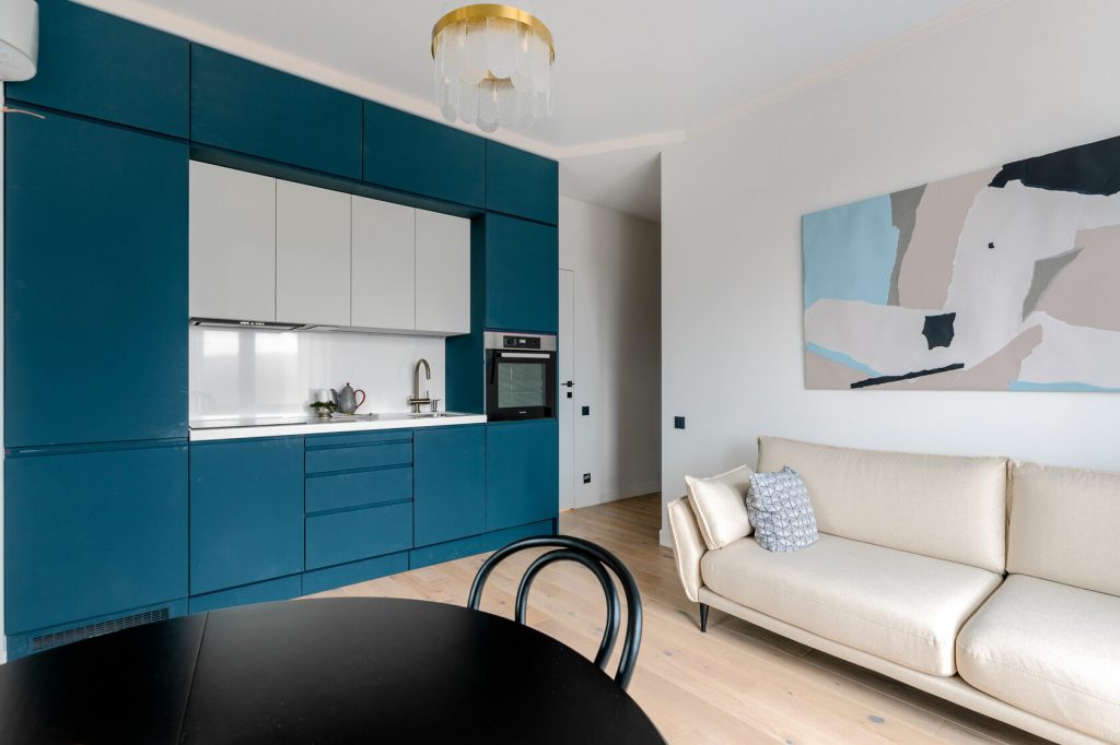 В результате получилась светлая, стильная квартира, в которой использовался синий цвет в качестве акцентного. Многофункциональная кухня удачно была совмещена с гостиной, в которой эргономично расположилась вся необходимая мебель.