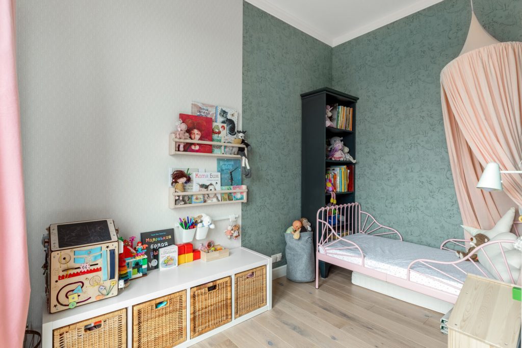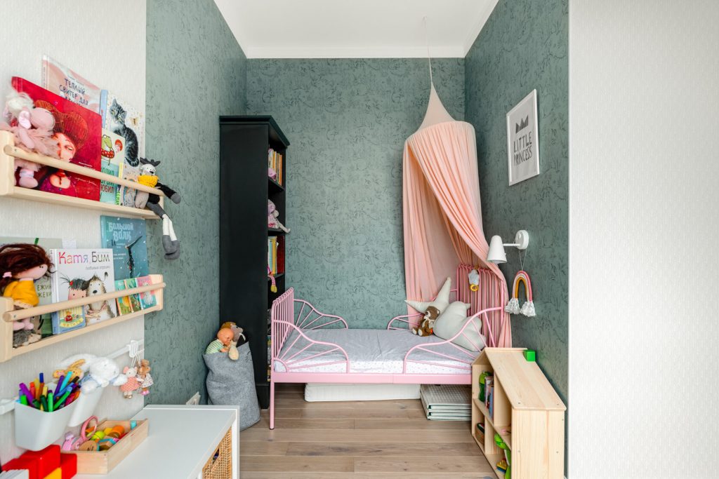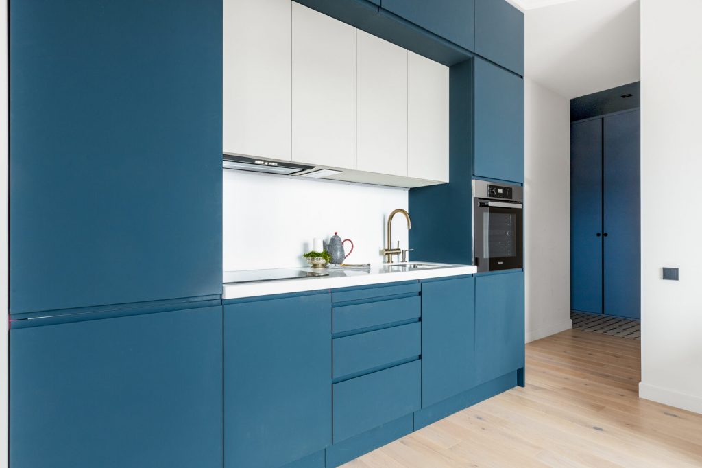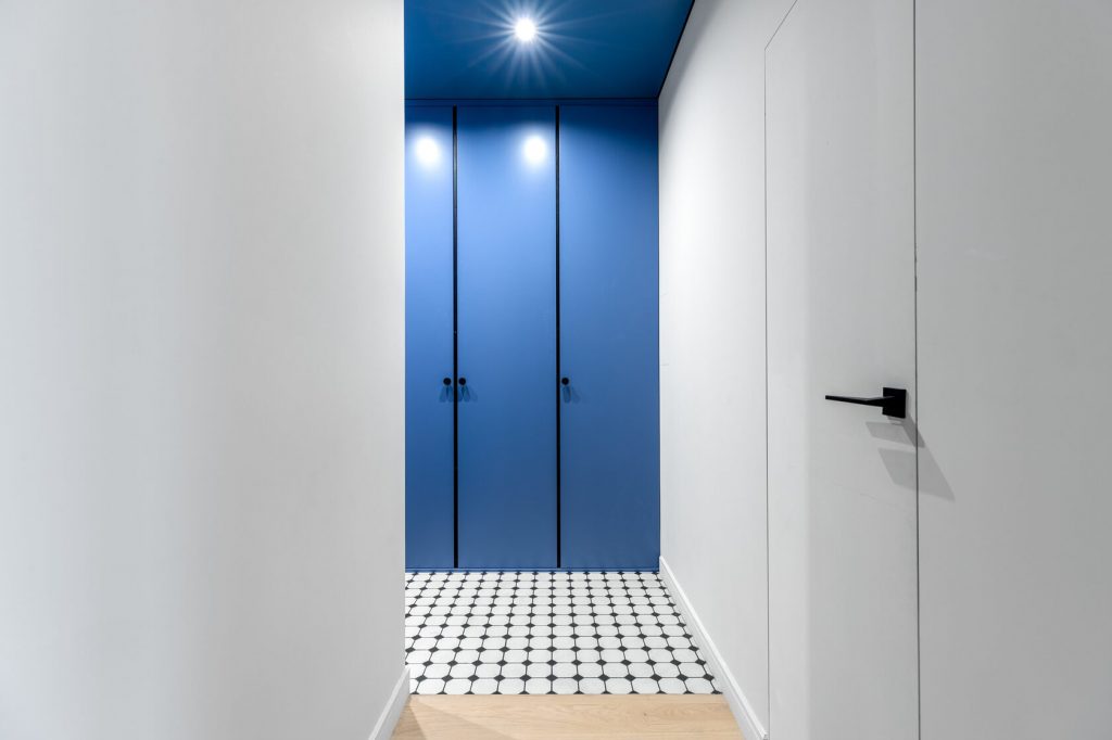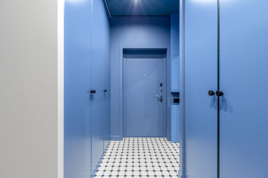 Ремонт двухкомнатной квартиры с меблировкой и изготовлением мебели от Domeo, для молодой семьи с маленькой дочкой с использованием синего цвета в качестве акцентного, с прихожей, кухней-гостиной, мастер-спальней, детской комнатой и санузлом