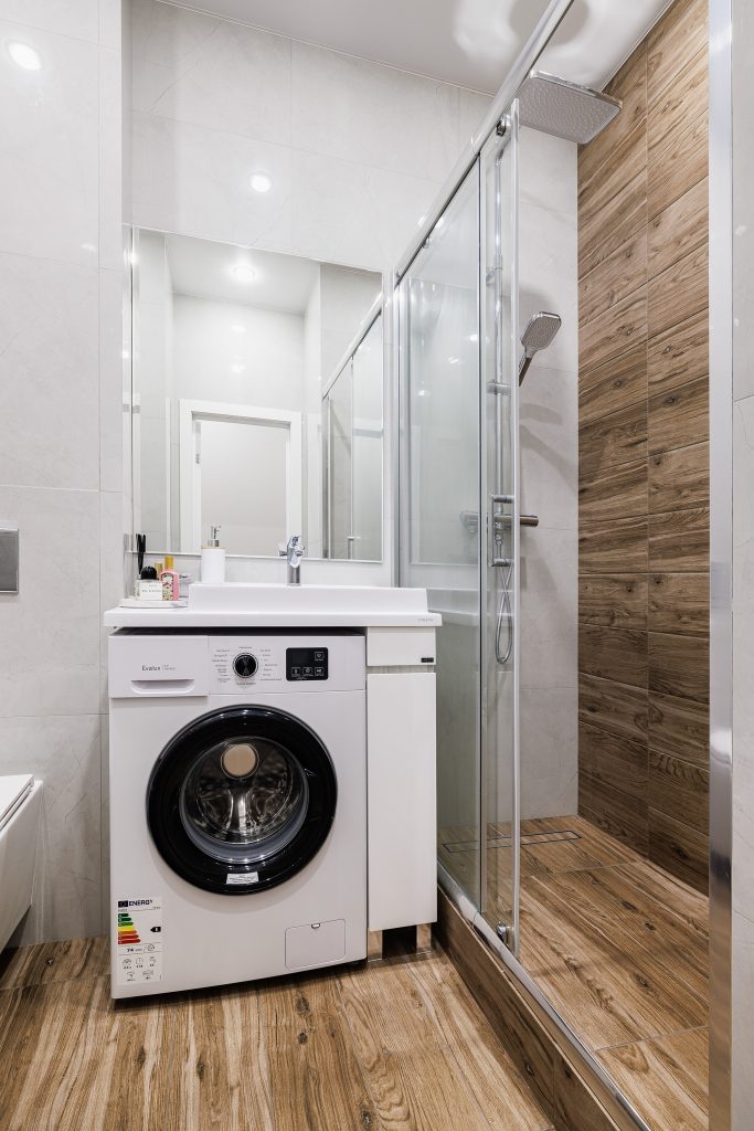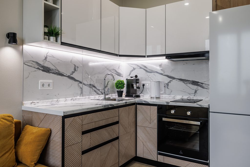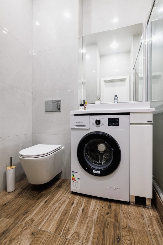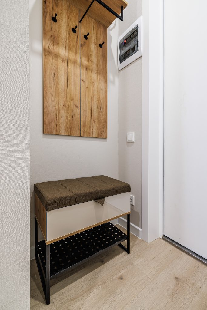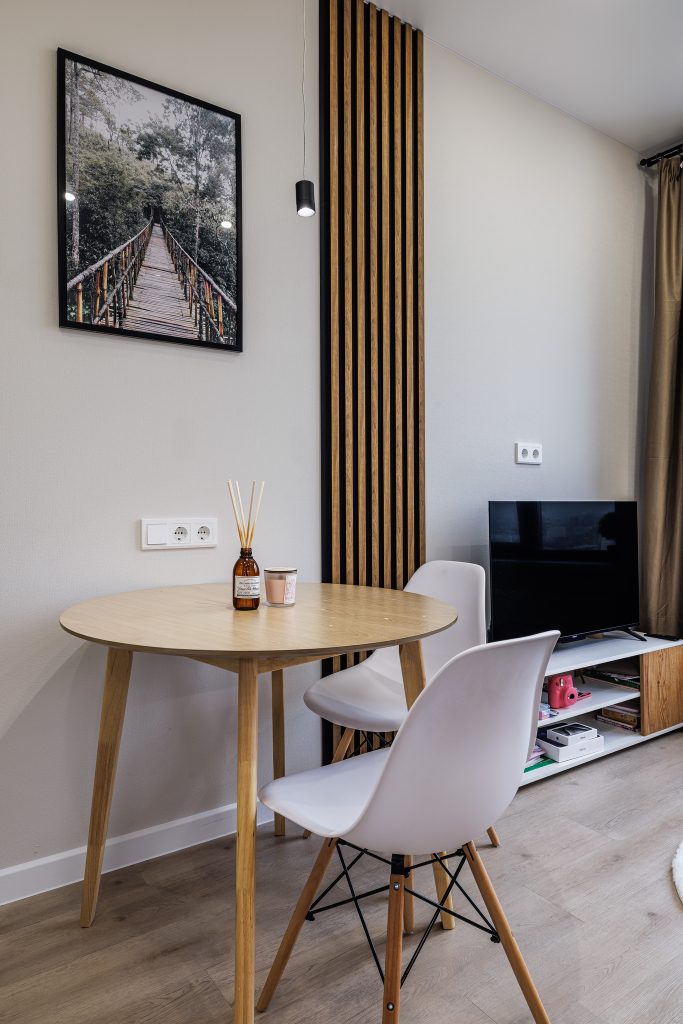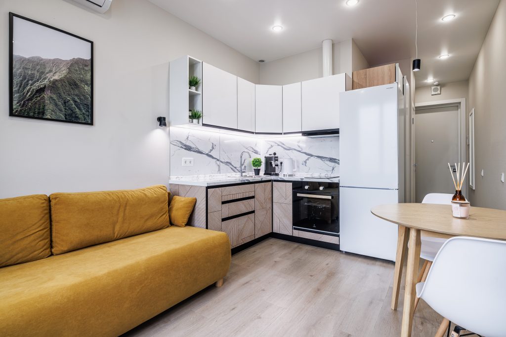 Ремонт светлой студии для молодого человека, который предпочитает минимализм, но любит яркие акценты и стильные детали, с прихожей, кухней-гостиной и санузлом