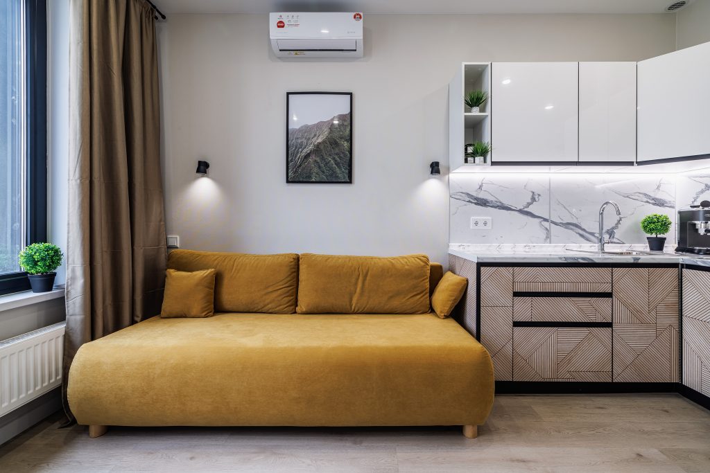 Современная студия в светлых тонах с ярким горчичным акцентом