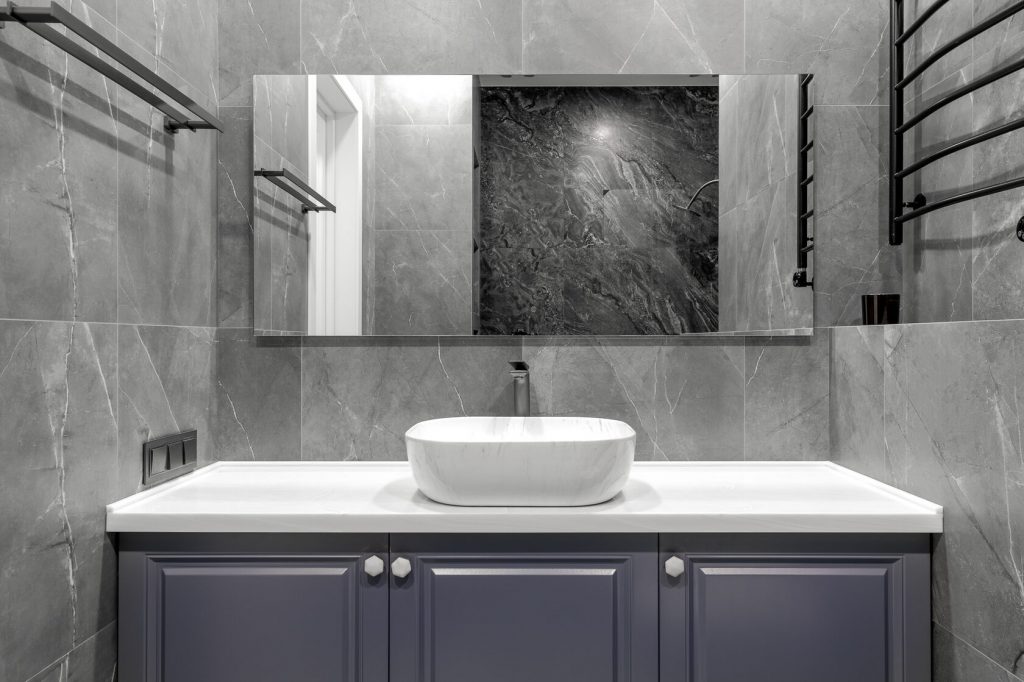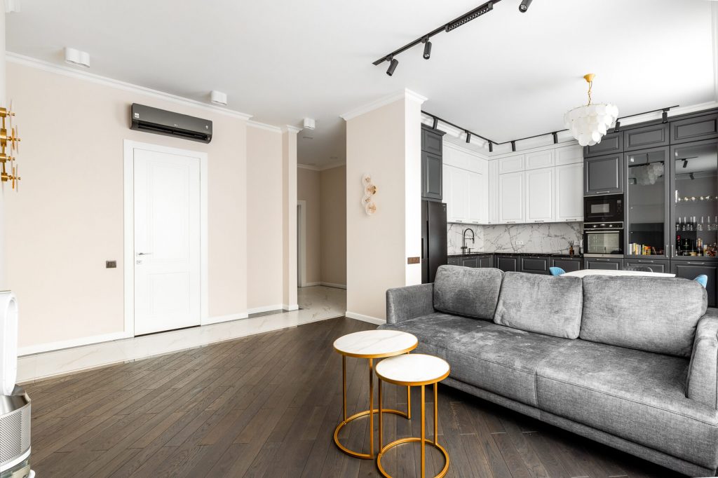 Современная квартира в серых тонах с яркими акцентами