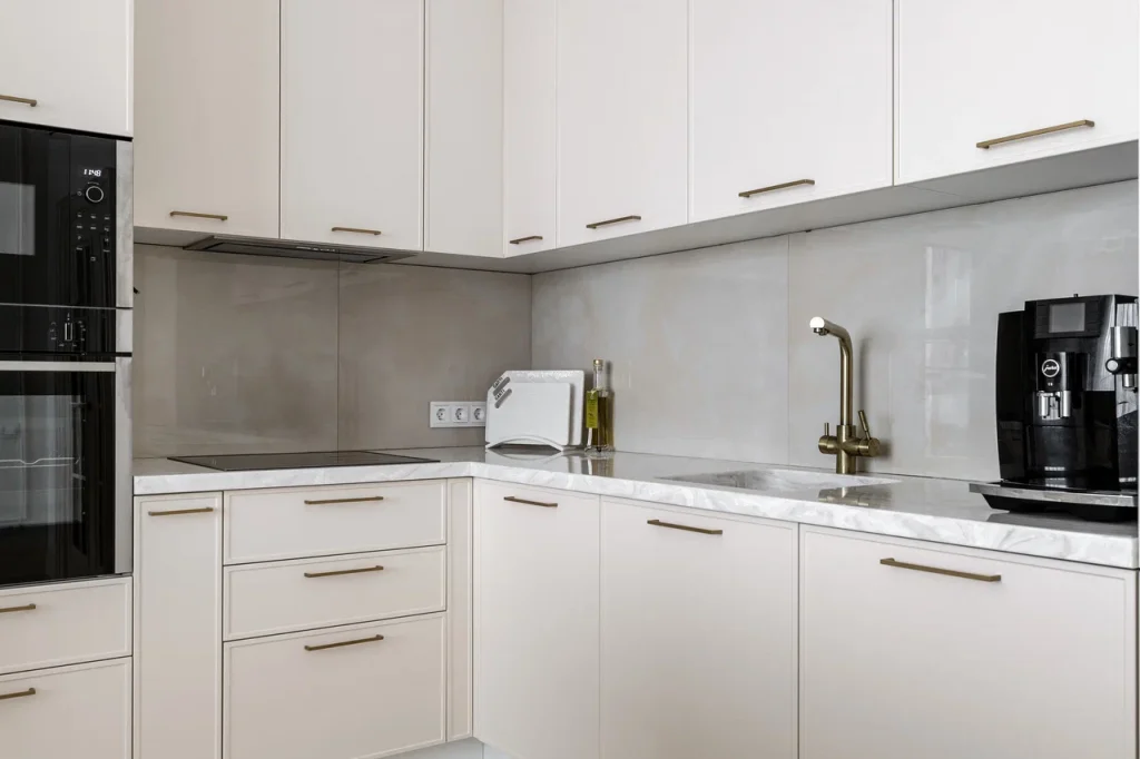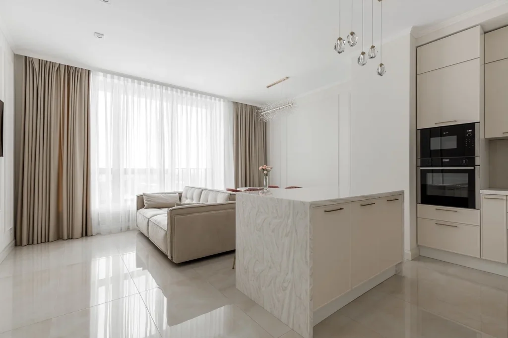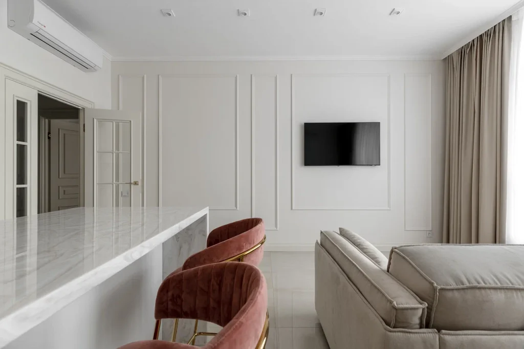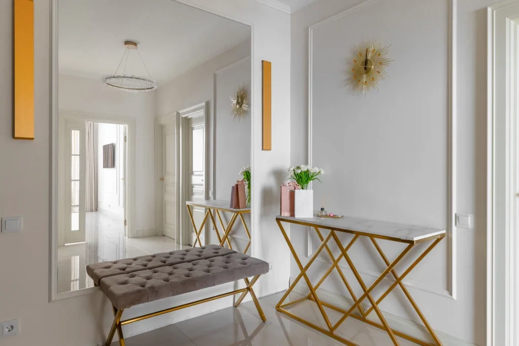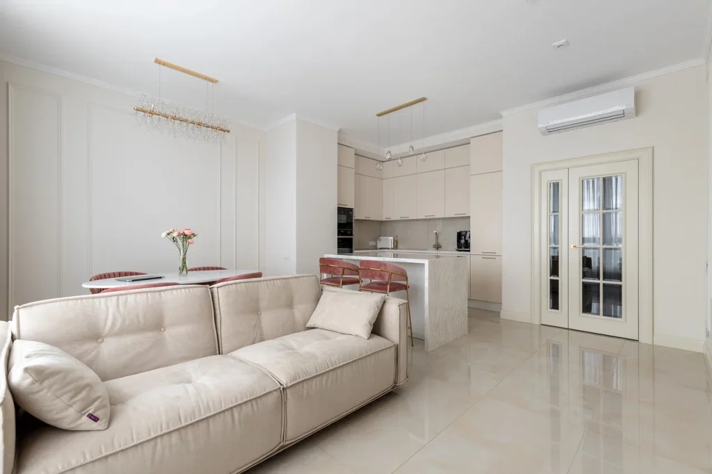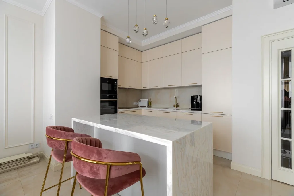 Ремонт евродвушки с меблировкой и изготовлением мебели от Domeo, с интерьером в светло-нежных оттенках с добавлением золотых элементов, с прихожей, кухней-гостиной, спальней, гардеробной и санузлом