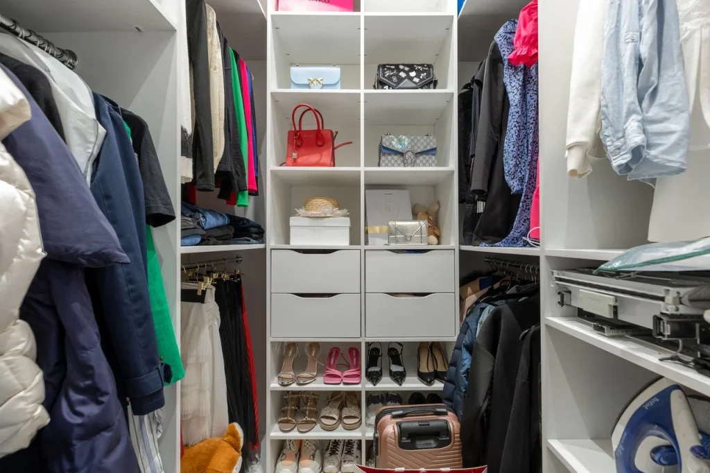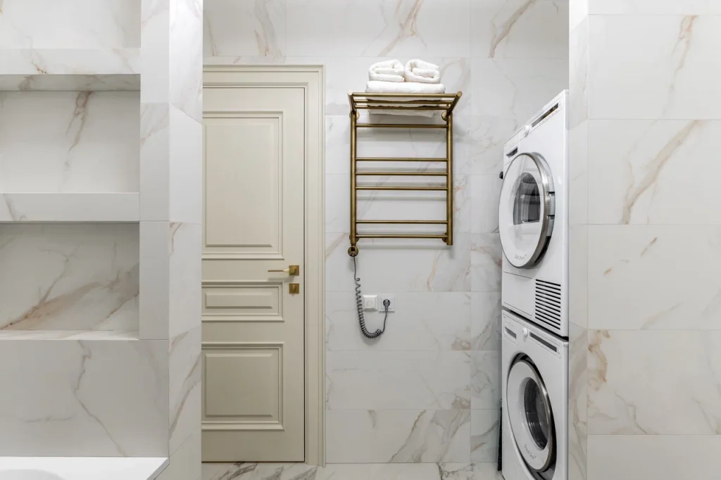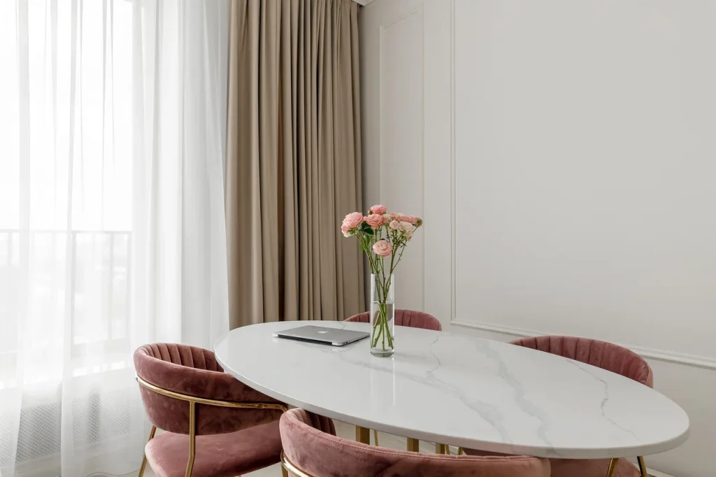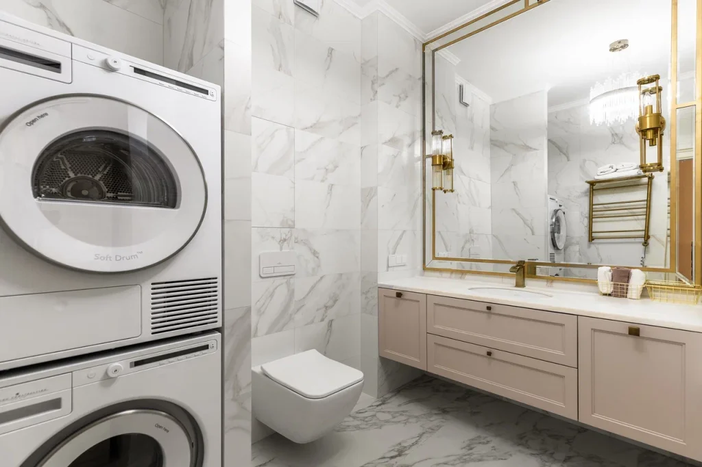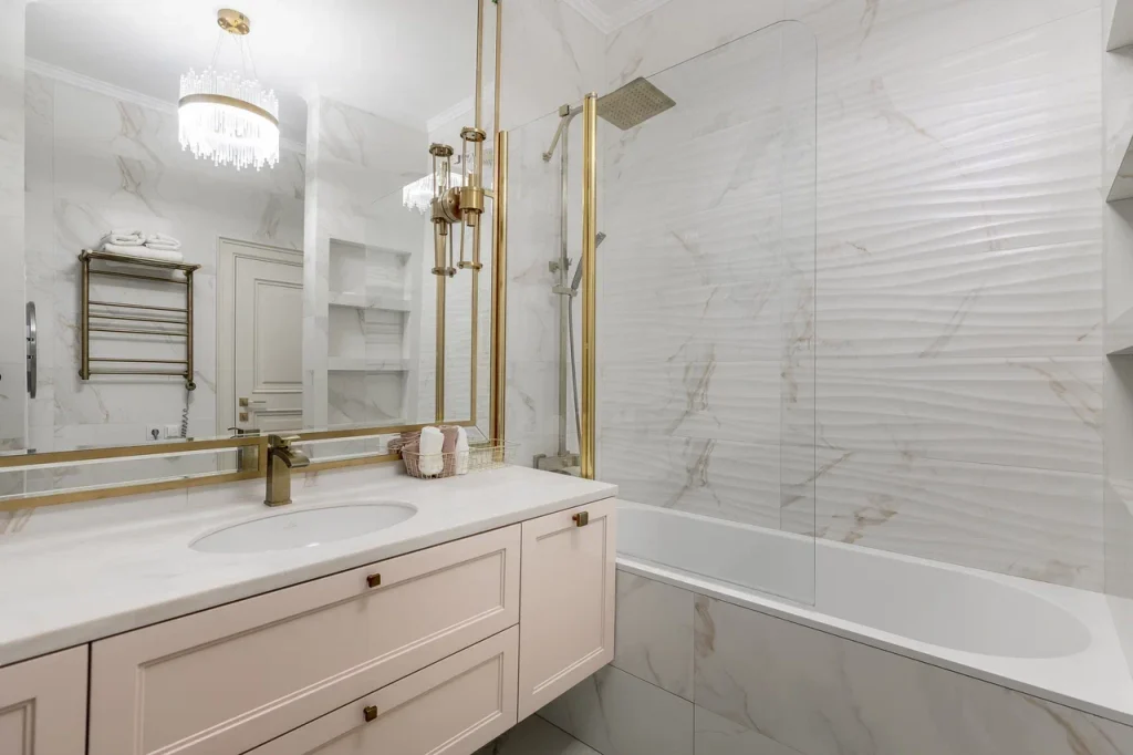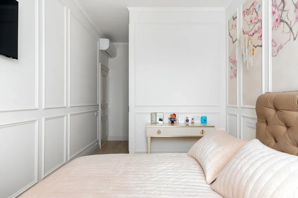 Ремонт евродвушки с меблировкой и изготовлением мебели от Domeo, с интерьером в светло-нежных оттенках с добавлением золотых элементов, с прихожей, кухней-гостиной, спальней, гардеробной и санузлом