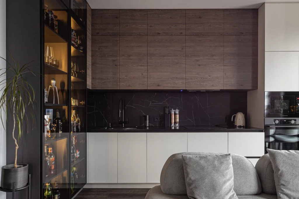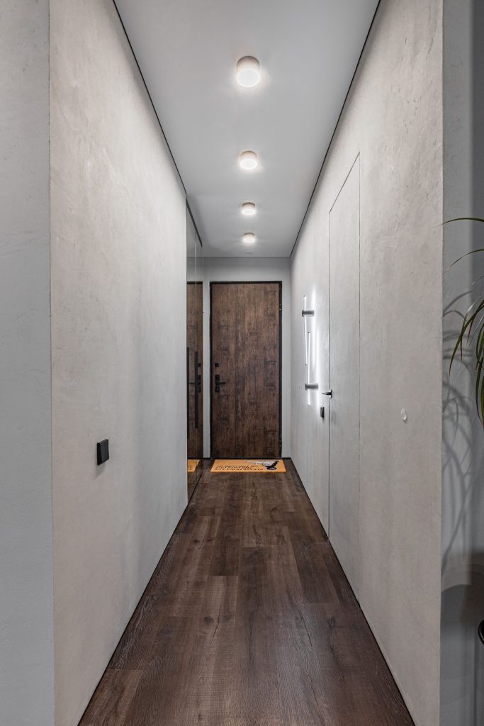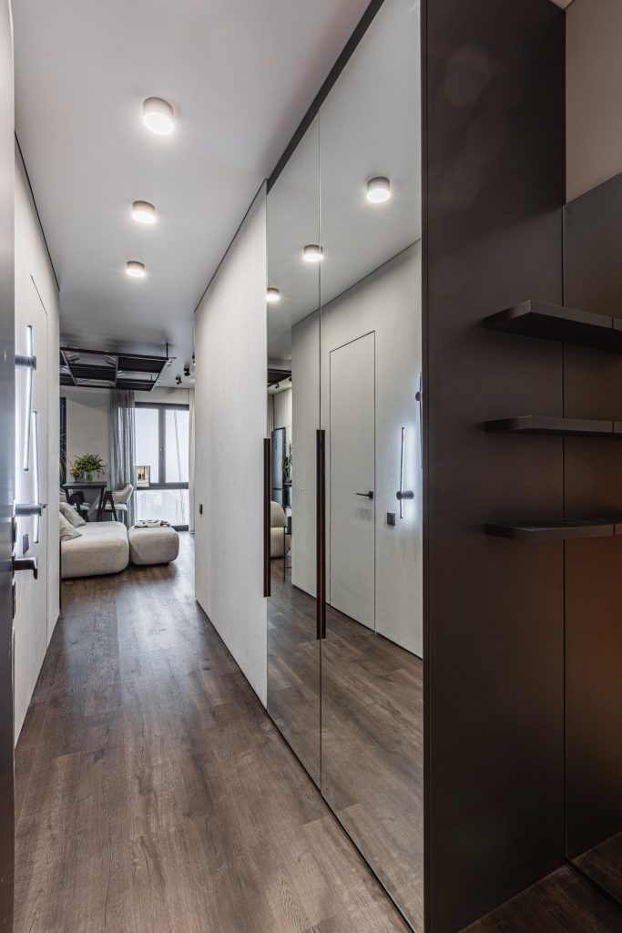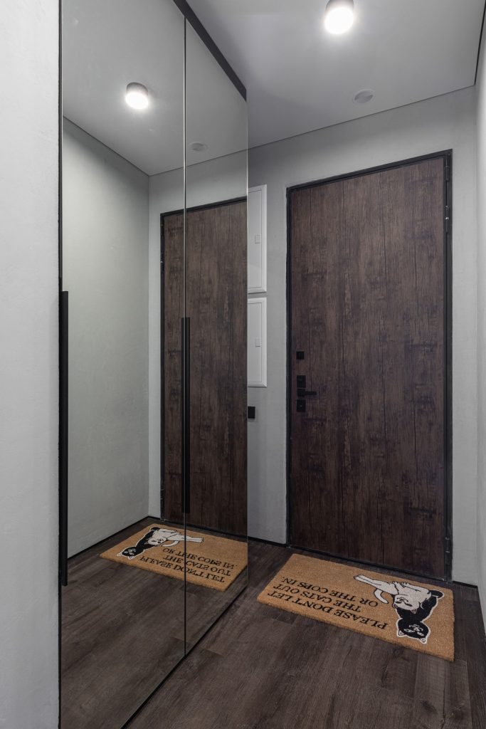 Ремонт контрастной евротрешки с меблировкой и изготовлением мебели от Domeo, с интерьером, вдохновленным реферансами из Pinterest, с прихожей, кухней-гостиной, спальней, детской комнатой, гардеробной и двумя санузлами