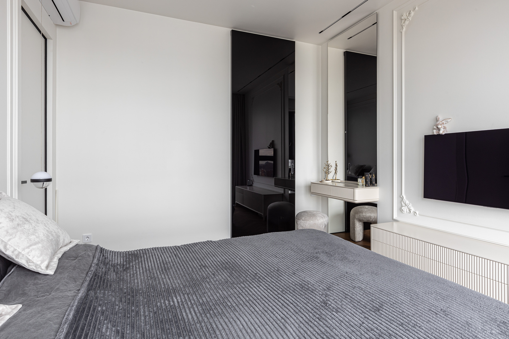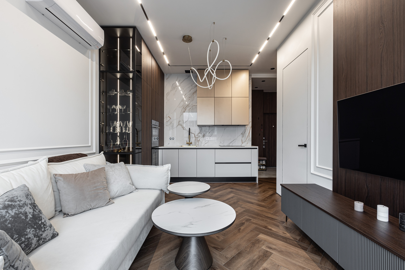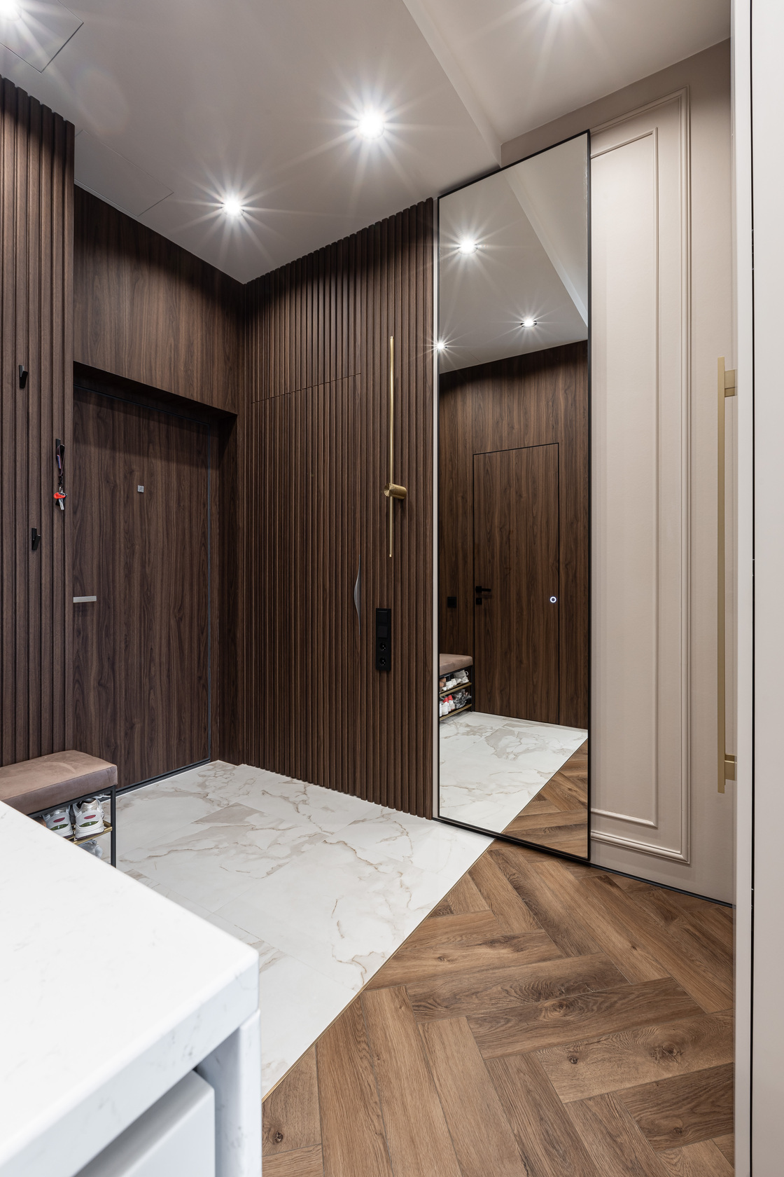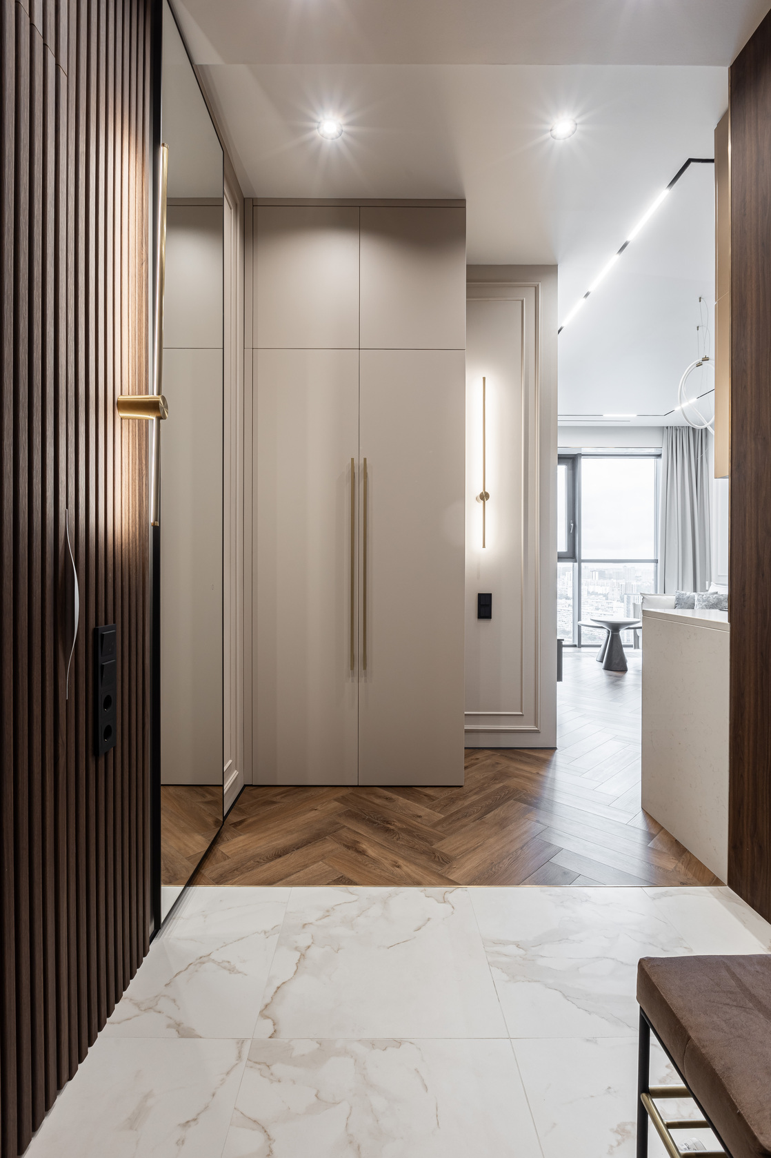 Ремонт квартиры свободной планировки с преобразованием в евродвушку в стиле современная классика, с прихожей, кухней-гостиной, спальней, гардеробной, постирочной и санузлом