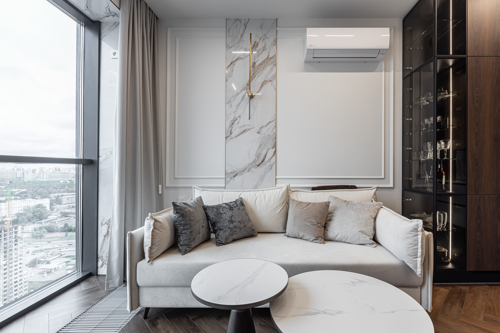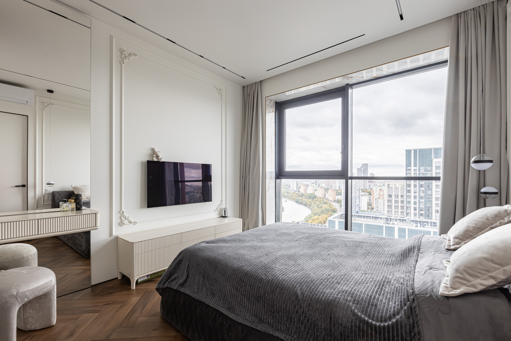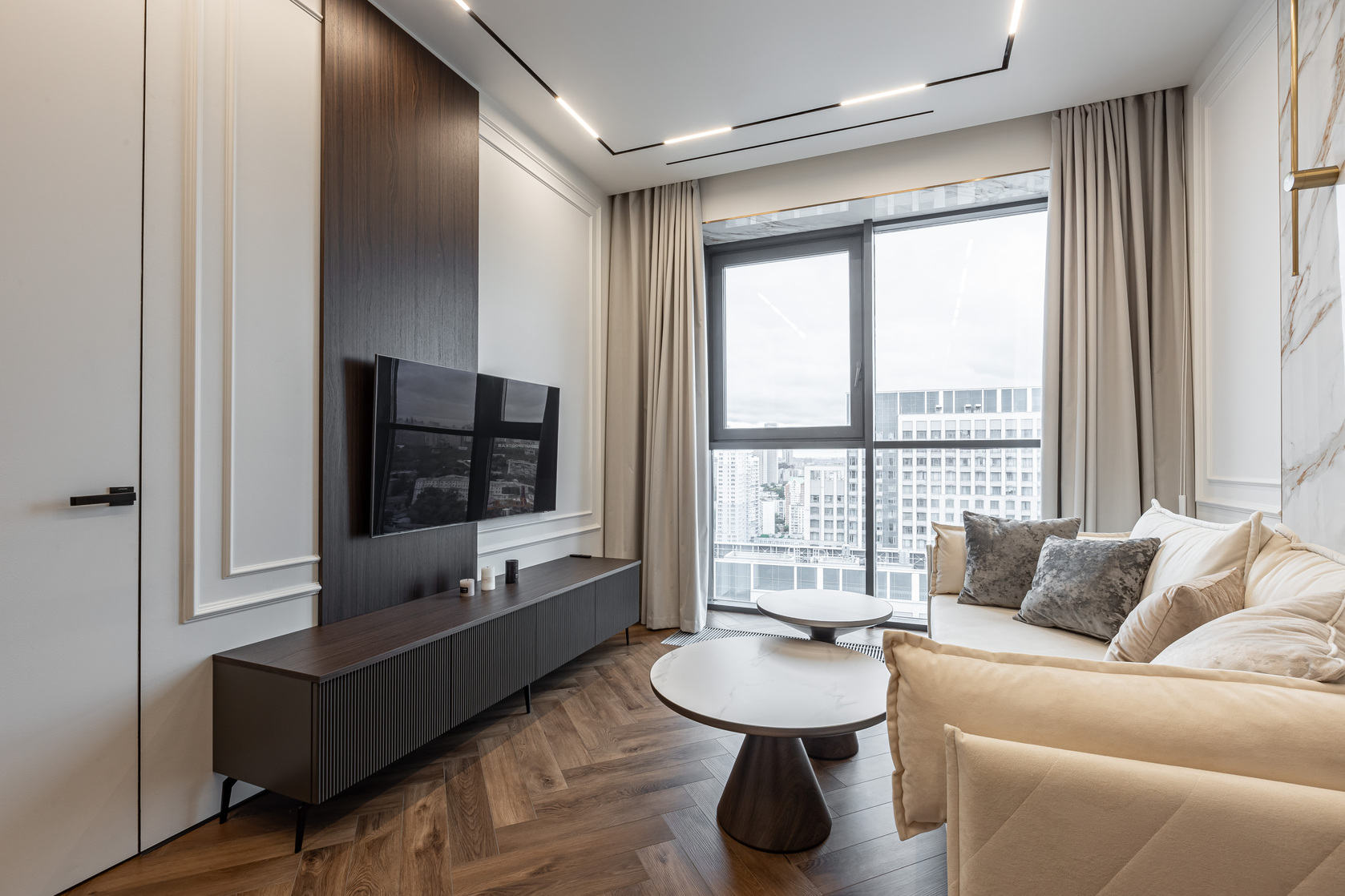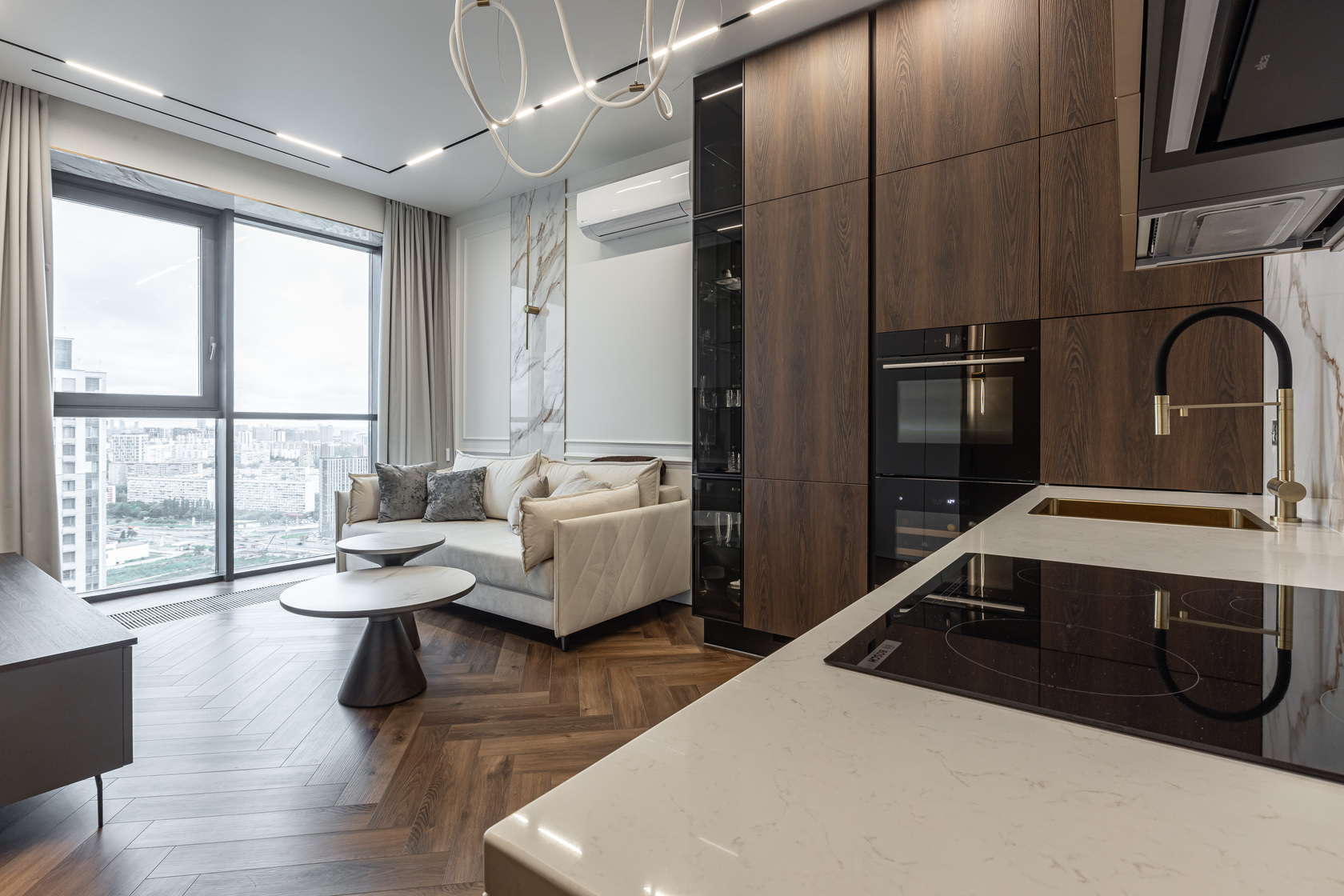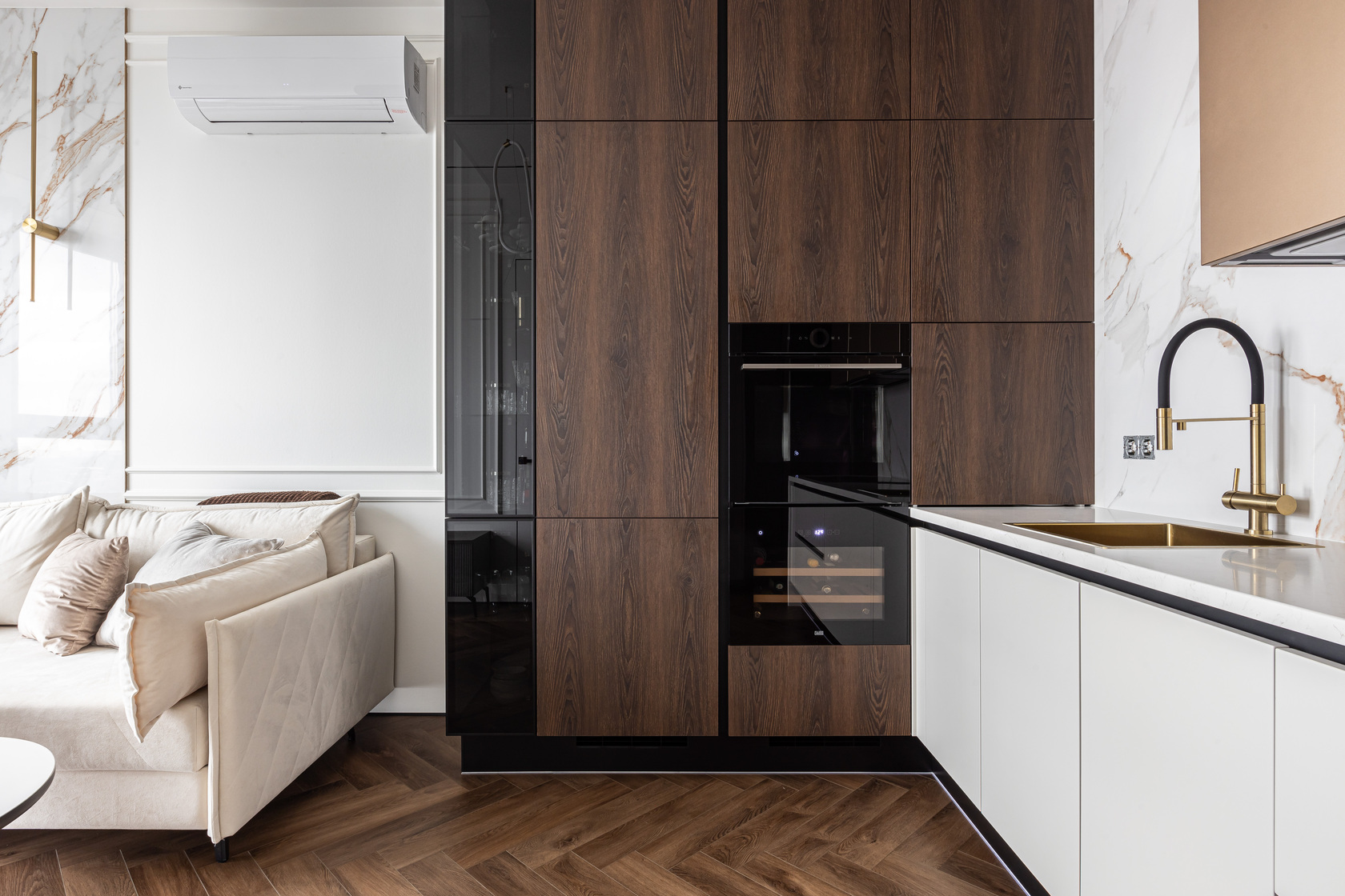 Ремонт квартиры свободной планировки с преобразованием в евродвушку в стиле современная классика, с прихожей, кухней-гостиной, спальней, гардеробной, постирочной и санузлом