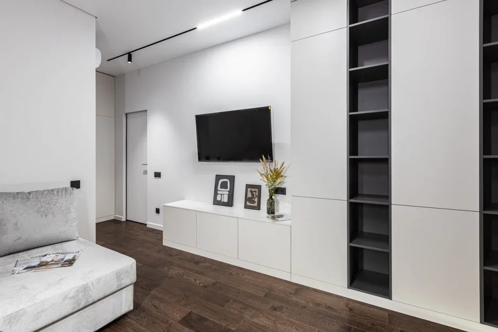 Ремонт евротрешки с меблировкой и изготовлением мебели от Domeo, в стиле минимализм, с идеальной планировкой и продуманным хранением, с прихожей, кухней-гостиной, спальней, кабинетом и двумя санузлами