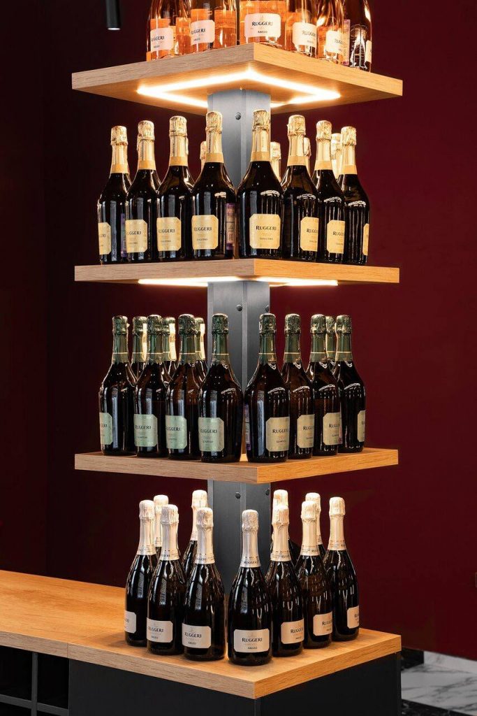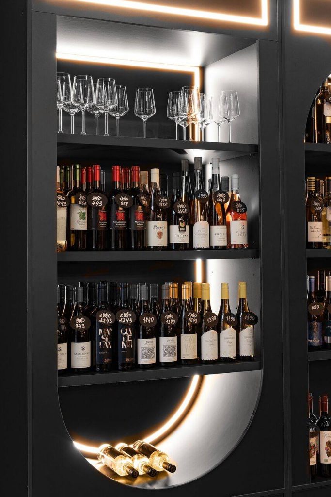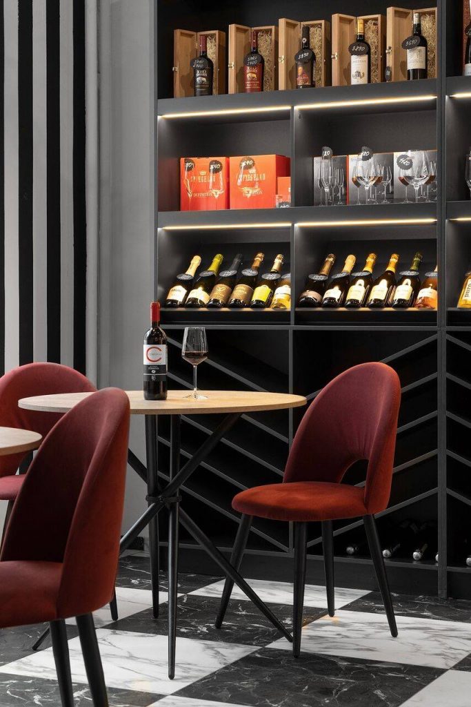 Винотека в красных, черных и белых цветах с бархатными стенами и потолком