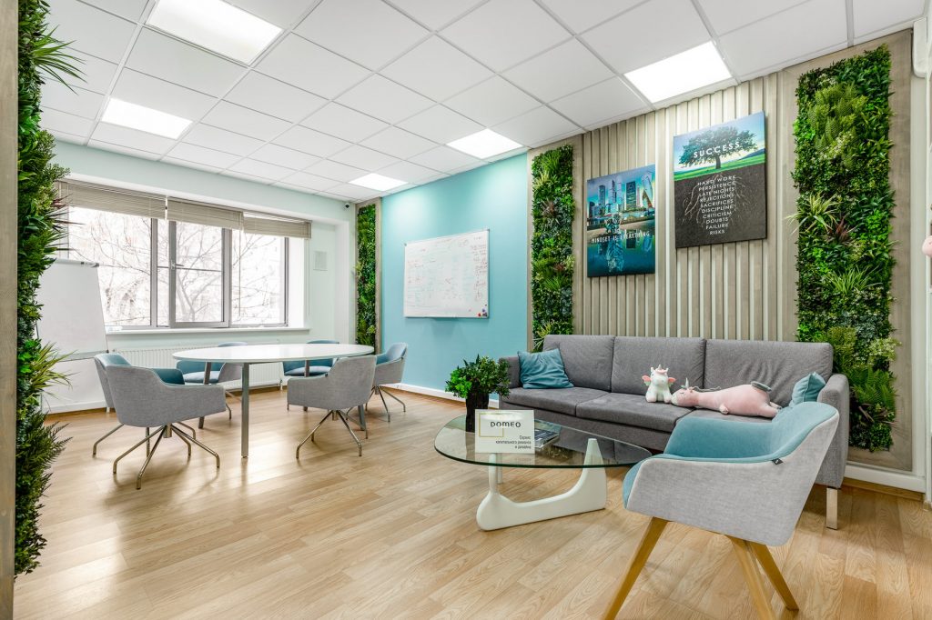 Для команды Domeo стояла непростая задача: нам нужно было обновить ремонт в существующем пространстве, который отражал бы ценности и символику, а также атмосферу большого коллектива лучшей инвестиционной компании Impact Capital. Учли также необходимость продолжения рабочего процесса даже во время ремонта, поэтому мы организовали оперативную доставку необходимой для этого мебели. В оформлении были использованы фитопанно, стильные постеры и карта мира, а также настенные принты, позволяющие бюджетно украсить пространство. Главный символ компании — единорога — мы уместно и органично интегрировали в современный интерьер.