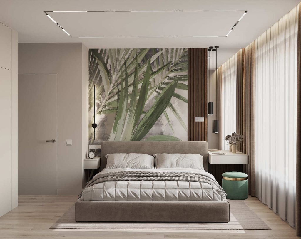 К примеру, ламинат укладывался елочкой, есть ниши с подсветкой, фальш-стена из реек, розетки в цвет мебели.
